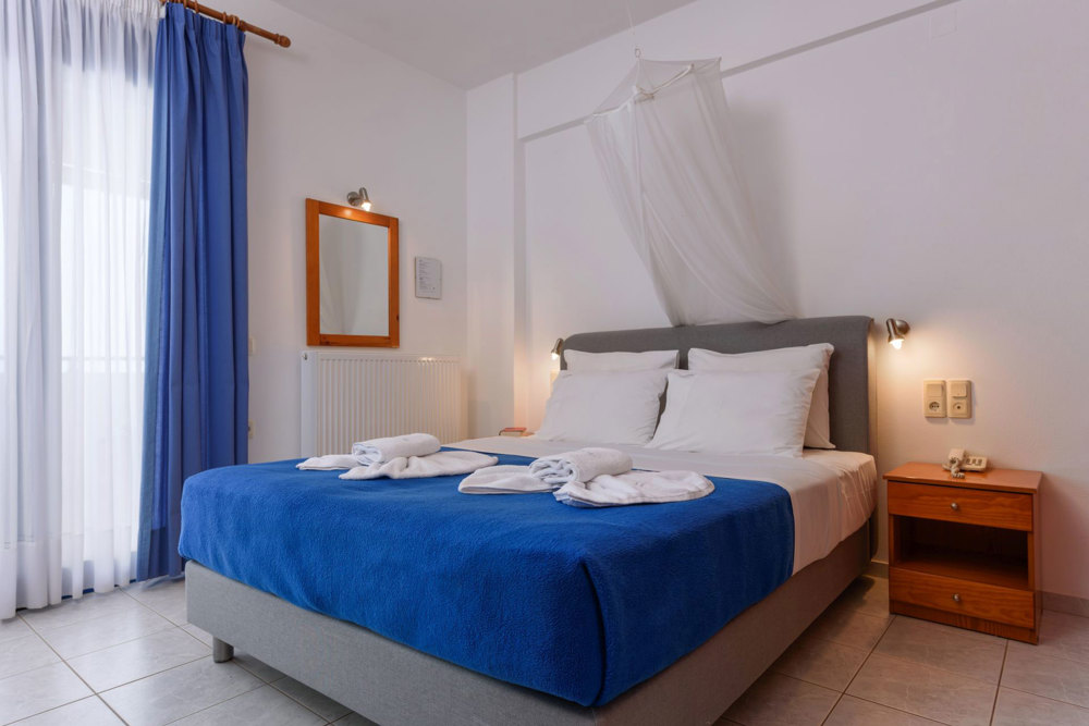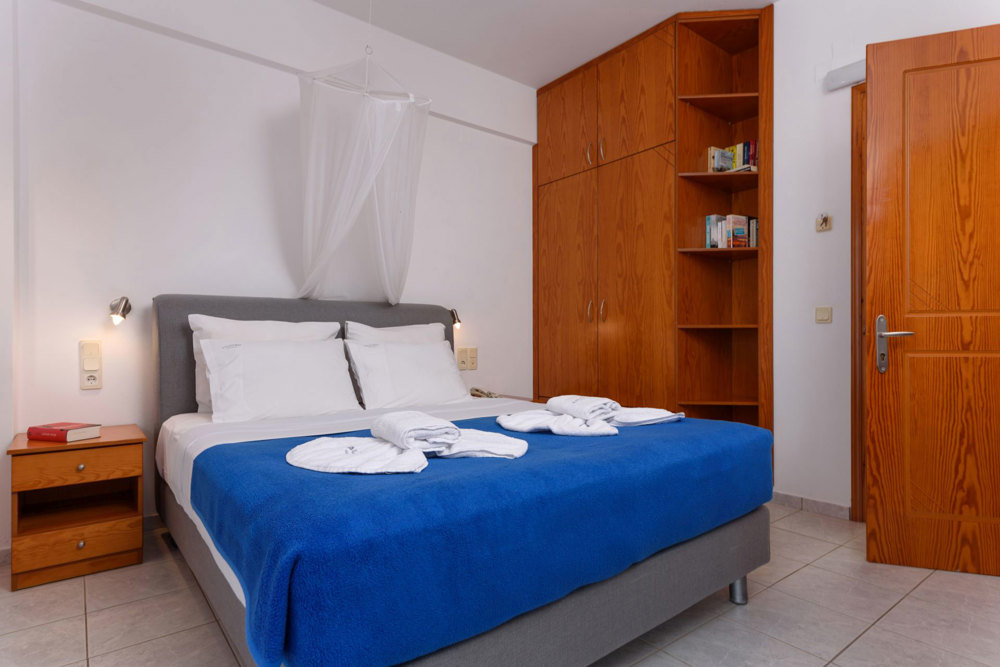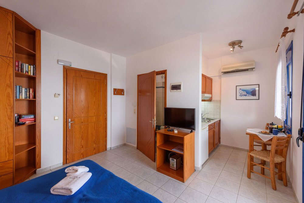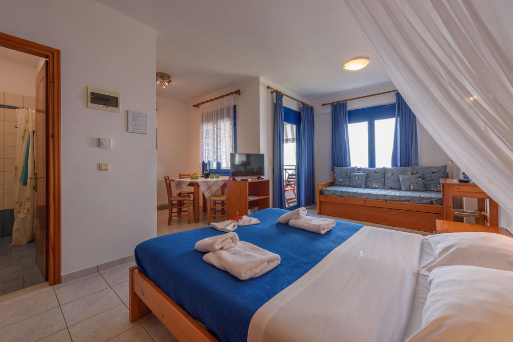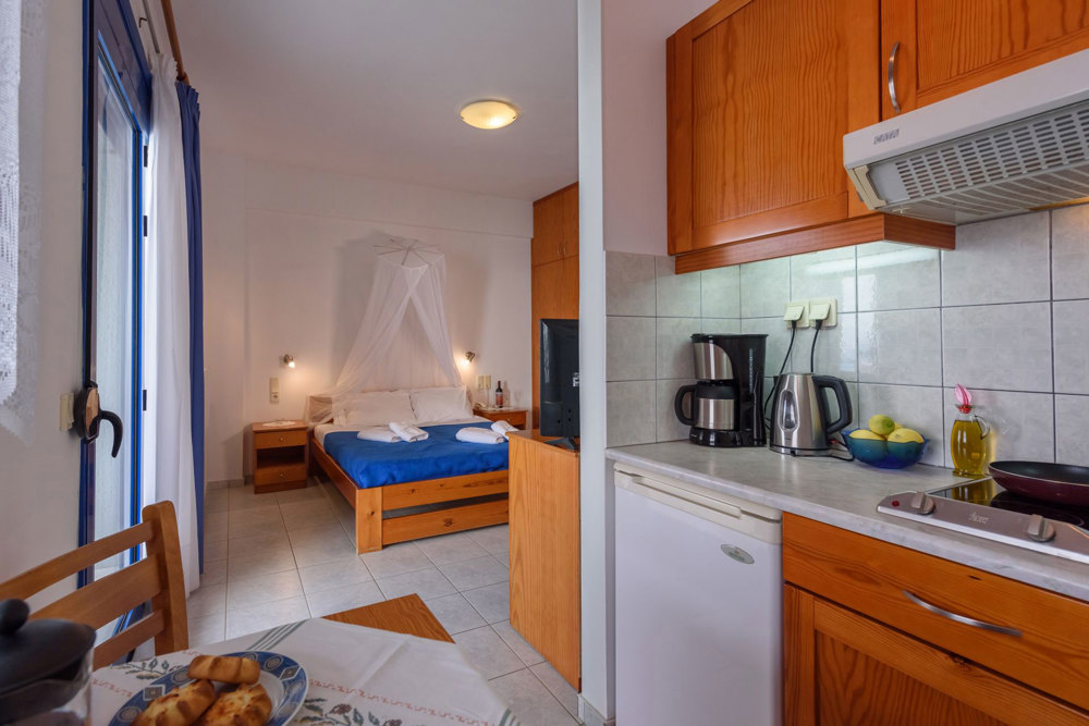 Im Apartment haben Sie einen geräumigen Wohn- und Essraum mit Esstisch und Sofa. Die zwei Einzelbetten (Matratzen 90x200) sind eine Sonder-Anfertigung und sind geschmackvoll als Sofa dekoriert. Die Küche ist sehr gut ausgestattet, mit allem, was man als Selbstversorger im Urlaub benötigt. Vom Sparschäler über Brotmesser, Obstmesser und Korkenzieher bis hin zu Kaffeemaschine, Wasserkocher und Toaster ist alles vorhanden. Zwei Ceran-Kochfelder, Töpfe und Pfannen ermöglichen die unkomplizierte Zubereitung von kleinen Mahlzeiten. Und wer lieber essen geht, ist in nur wenige Minuten zu Fuß direkt an der Strandpromenade, wo es eine vielfältige Auswahl an netten Tavernen mit vielen leckeren traditionellen Gerichten gibt. Die Apartments und Studios sind geräumig und haben meist auch noch Platz für ein Babybettchen. Die Bäder sind ausgestattet mit einer Dusche. Fragen Sie einfach nach, wenn Sie etwas benötigen. Der Strand liegt direkt vor dem Haupthaus FINIKAS I, wo man auch im Schatten, auf der großen Veranda, sitzen kann. Der Service umfasst tägliche Reinigung und 3 tägig frische Bettwäsche und Handtücher (auch Geschirrtücher und Spül-schwamm und Wischlappen). Private Wäsche kann gegen einen kleinen Unkostenbeitrag zum Waschen gegeben werden. Die Apartments kosten zwischen 90 Euro und 100 Euro pro Nacht, je nach Saison und Aufenthaltsdauer. E.O.T. Lizenz Nr.: ΜΗΤΕ 1039Κ032Α0013001